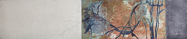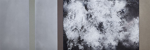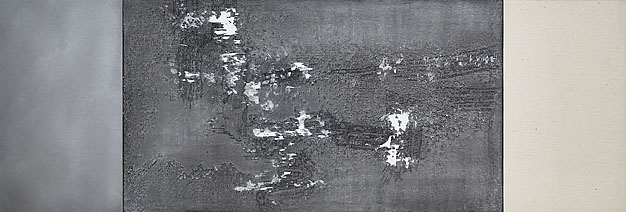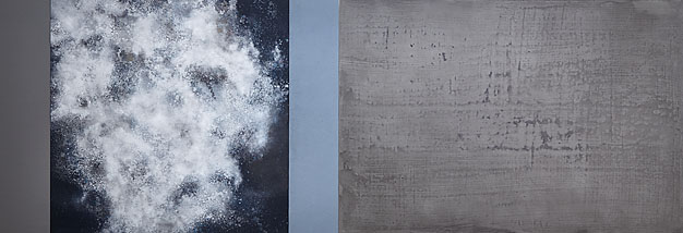 The paintings bring together active images with reflective or slow, silent, monochromatic panels. This introduces unusual time into the painting's content and viewer experience. Time is also highlighted by the fact that the images of some of the paintings were completed at different times. Some might have been forgotten for a long time but were rescued when they were placed as parts of later productions. This juxtaposition creates a tension: rediscovered images are displayed with minimalist panels in carefully considered arrangement and composition.For Raatikainen, painting is not merely paint and its application but also exploration of the meanings of various techniques and their interpretation. The paintings featured in this exhibition demonstrate this aim in their mixture of techniques and experimentations with various materials, for example aluminium and graphite. Raatikainen's use of mixed media is characterised by intuitive drawing and working the paint surfaces by washing. This information created from the resulting random image is then reworked in a controlled manner.