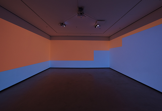 The design language of the images is minimalist/constructivist. Showing the images in succession creates a narrative, but not necessarily a story. The images are colour surfaces, where use of a single colour splits or frames another colour. At times, all three projections are just one bright colour, whereupon the image vanishes and the painting becomes a space. The viewer´s distance from the image sometimes seems to change when the hues fade or strengthen in relation to the previous image.
