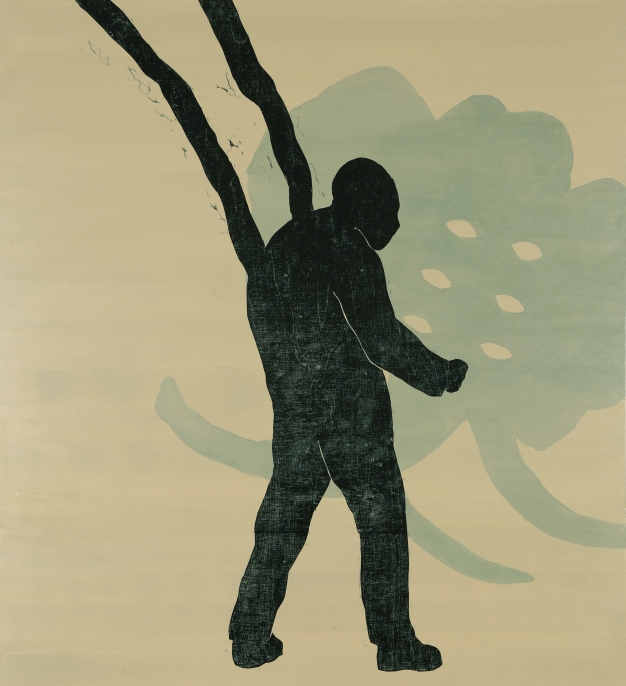 stilts, tentatively making his way, a tree bearing strange fruit and a boat