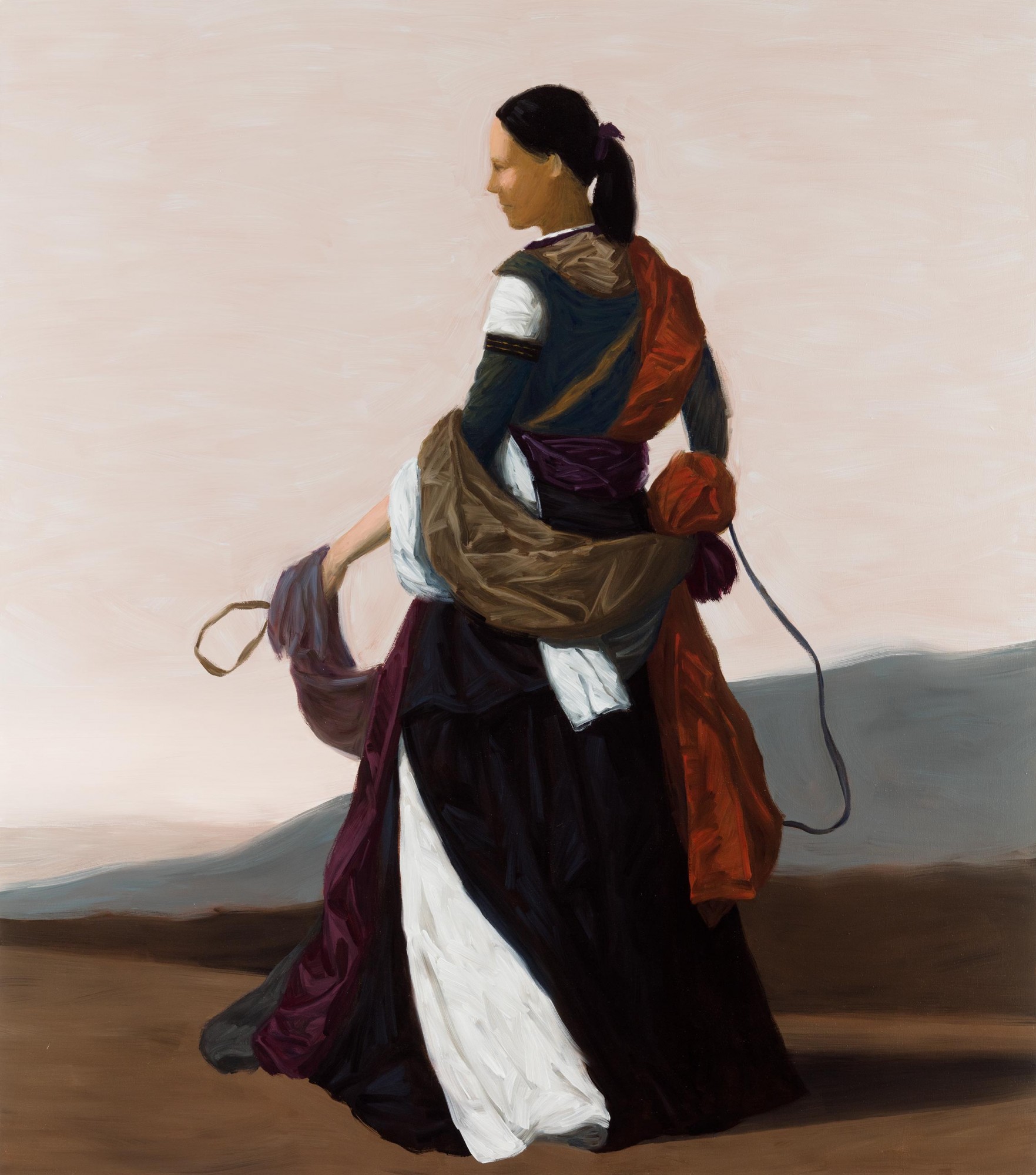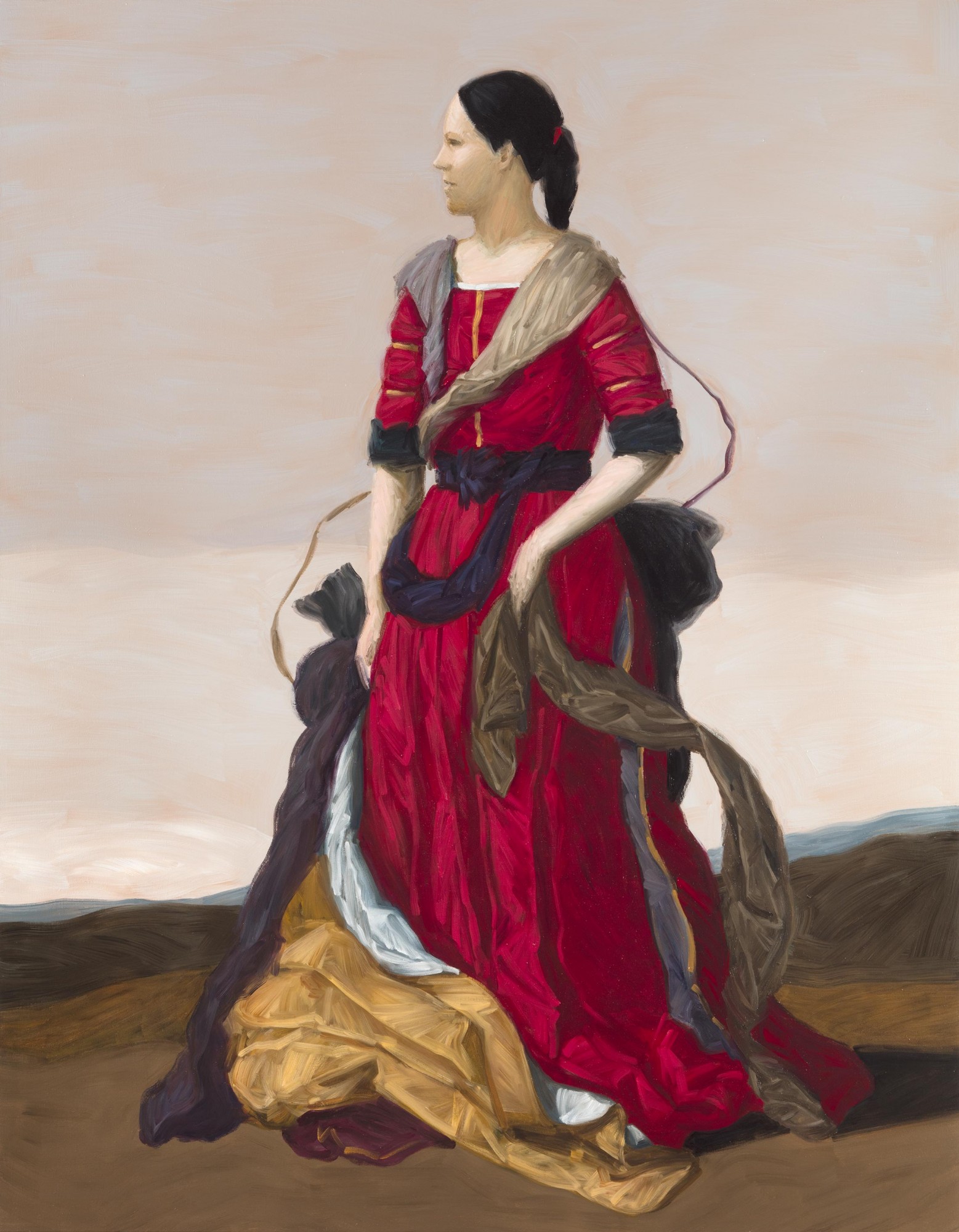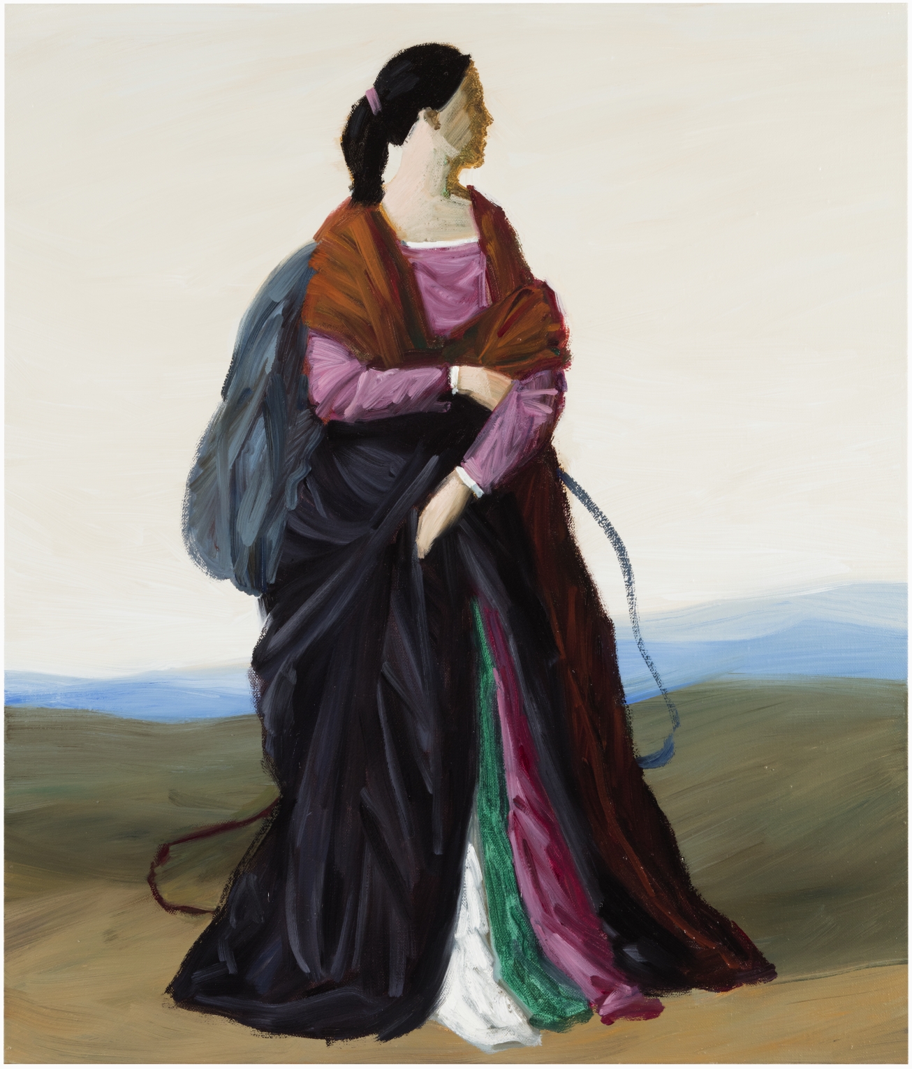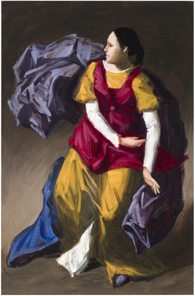 The drapery is rendered in stark brushstrokes, the opulent folds of fabric acquiescing to the dictates of the paintbrush. The emphatic materiality of abstract colour planes coalesces with the evocative rendering of real fabric textures. The outer contours of the silhouettes have grown softer.