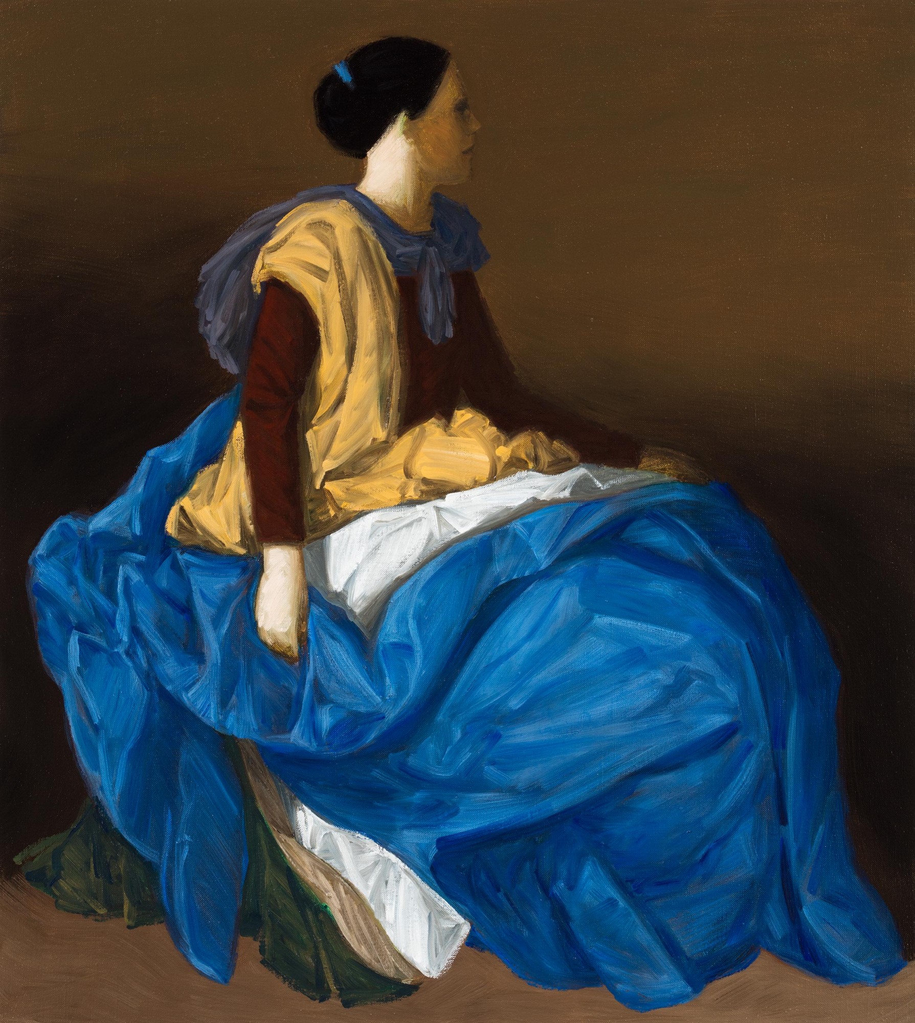 Opposites find balance in the painting Vicenza (2023): the perfect proportionality of the intense hues of the gown begins with the burnt brown crater, rising through the soft tonality of the velvet, finally progressing toward the chromatic spectrum of the rustling silver drapery.