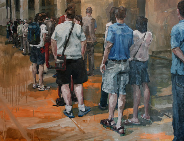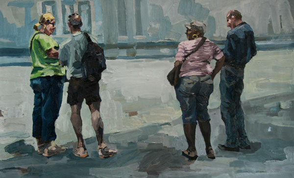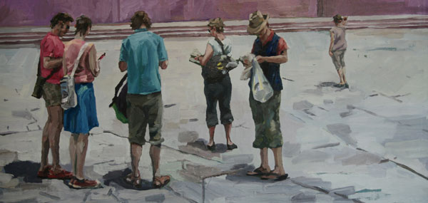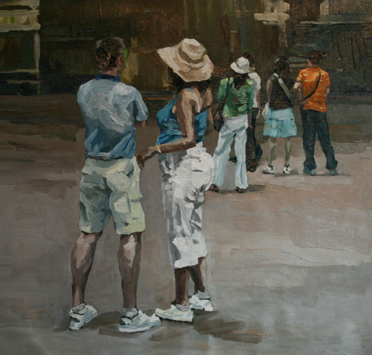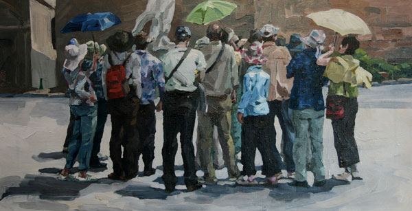 "At times, the tourists´ attention is turned away from their surroundings towards a map or a guide book, a stand-in for the original sight or attraction. Their attention might also be directed purely at other members of the group. It is as though the figures are striking a pose - not for the painter but rather at and in relation to each other. Indeed, it is the relationships and dynamics between the figures that give rise to the action in my paintings. With their turned backs, the figures are of course also a reflection on the very act of viewing art. Like the tourists, the viewer is left to search for meaning and to create their own personal relationship with what they are seeing."