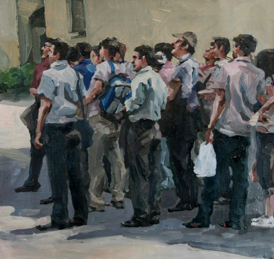 "A good example of this is my tourist series where the figures, flocking on city streets, have all their attention focused on their external environment, thereby unwittingly creating something resembling a spectacle or an impromptu choreography with parallels to animals´ herd behaviour.
