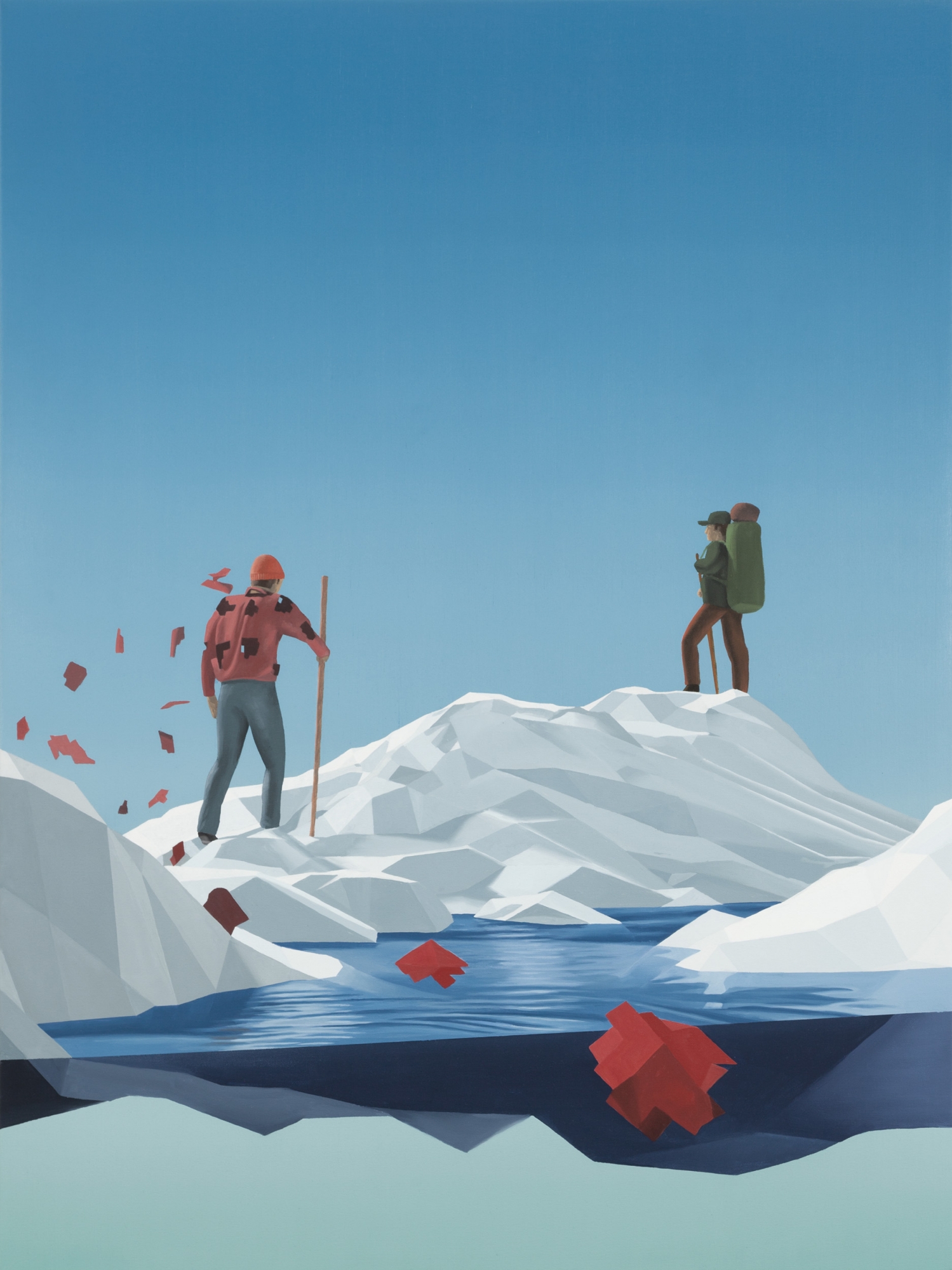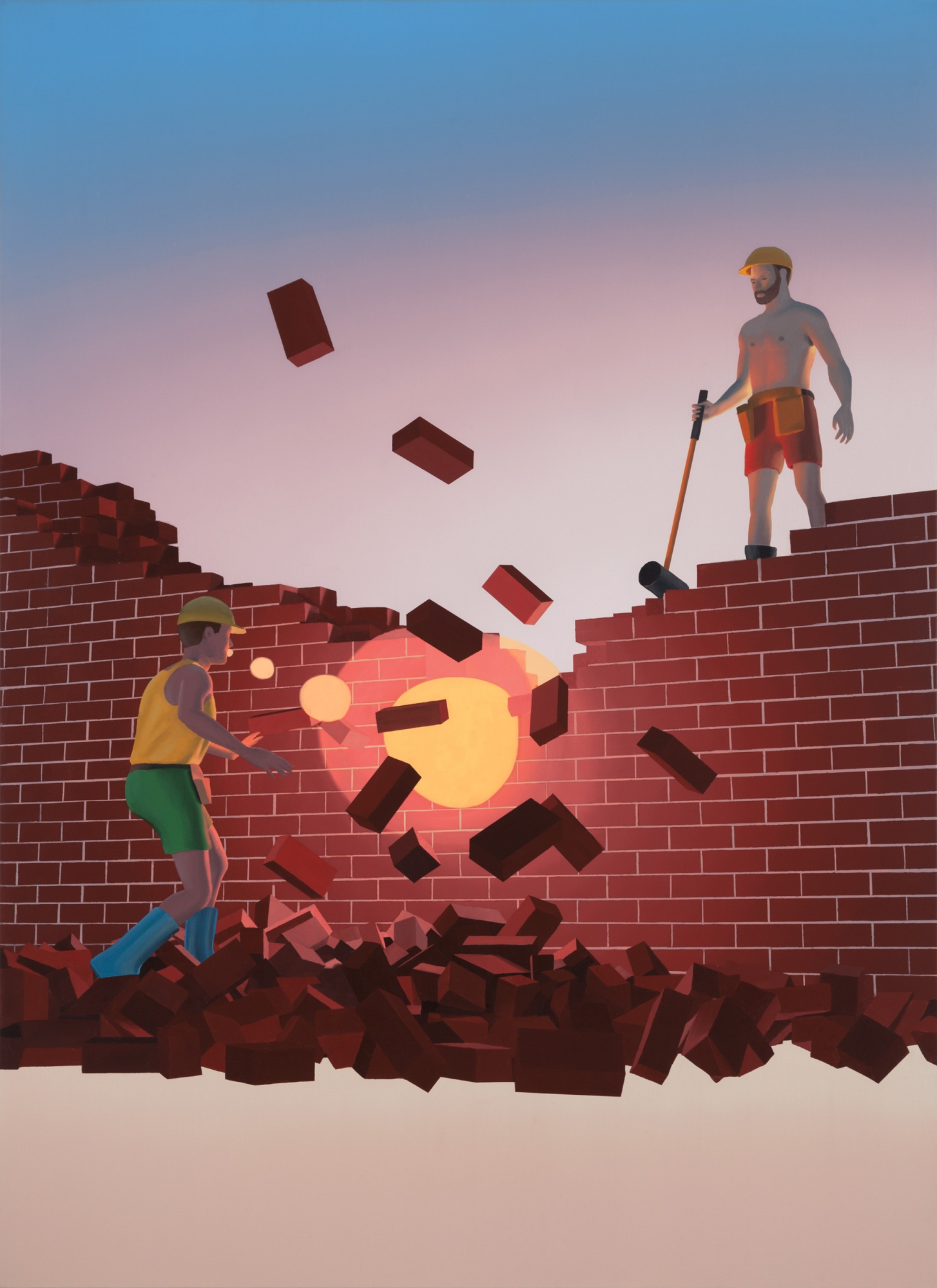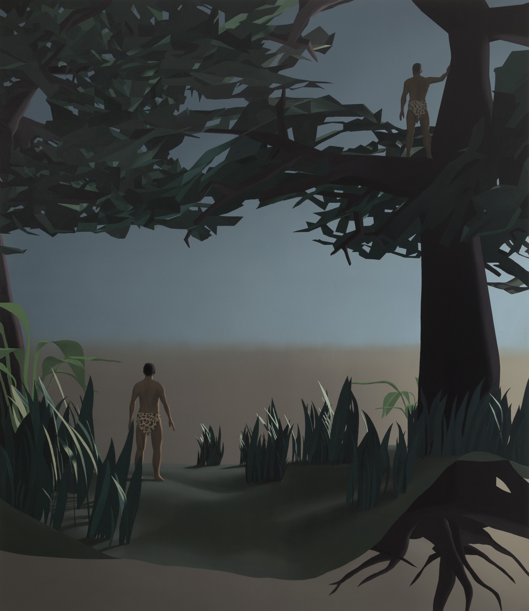 Teoksissa seikkailevat ystävykset ratsastavat yhdessä auringonlaskuun, tarinoivat meloessaan kanootilla ja pukeutuvat Tarzaneiksi. Vastinparina kuvaan myös yksinäisiä miehiä puurtamassa omakotitalon rakennustyömaalla ja halaamassa nyrkkeilysäkkiä.