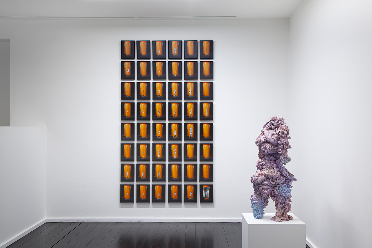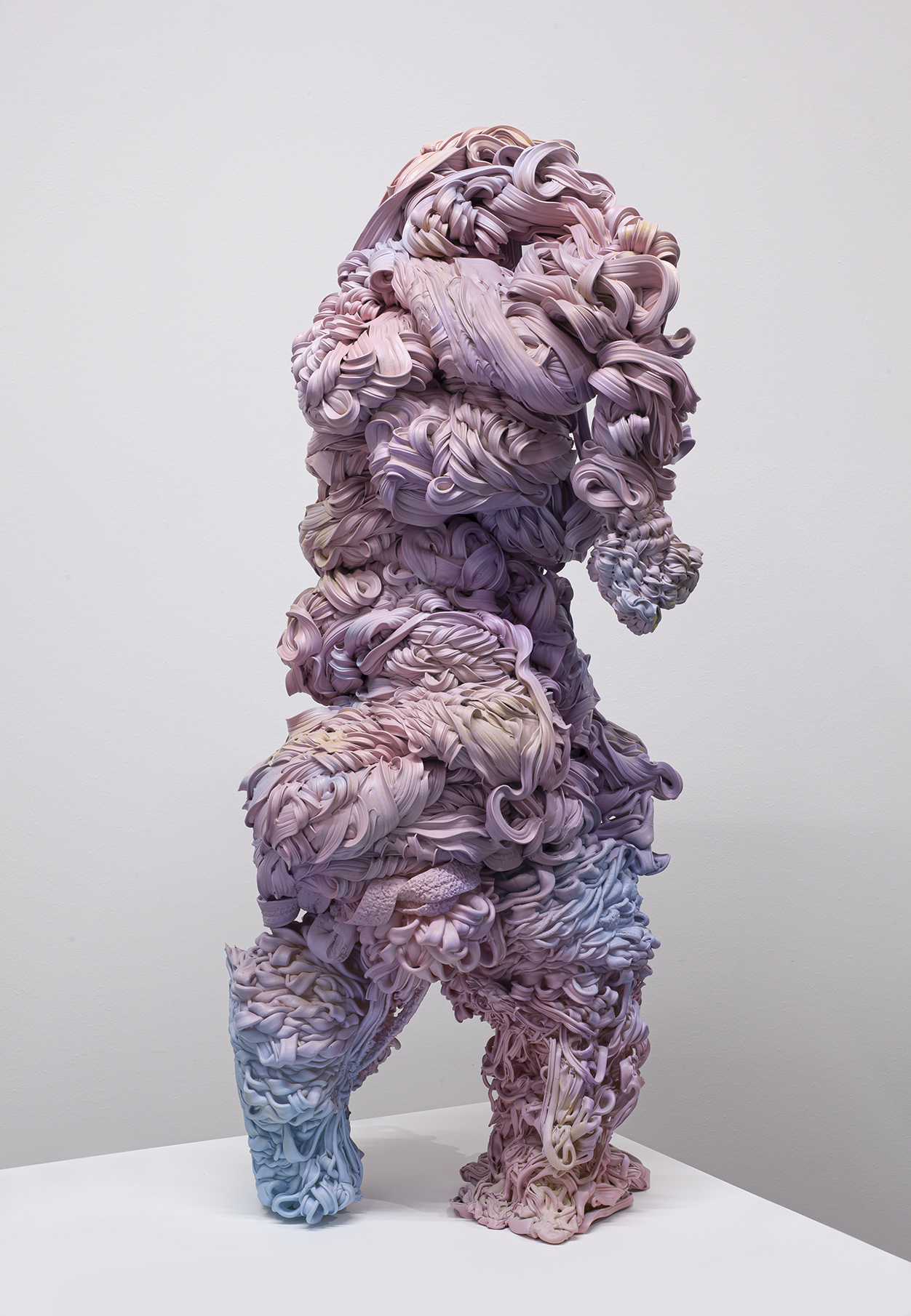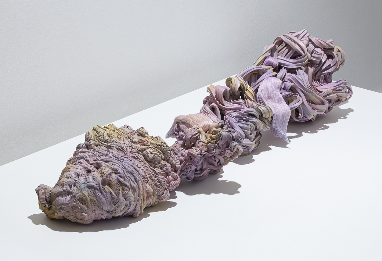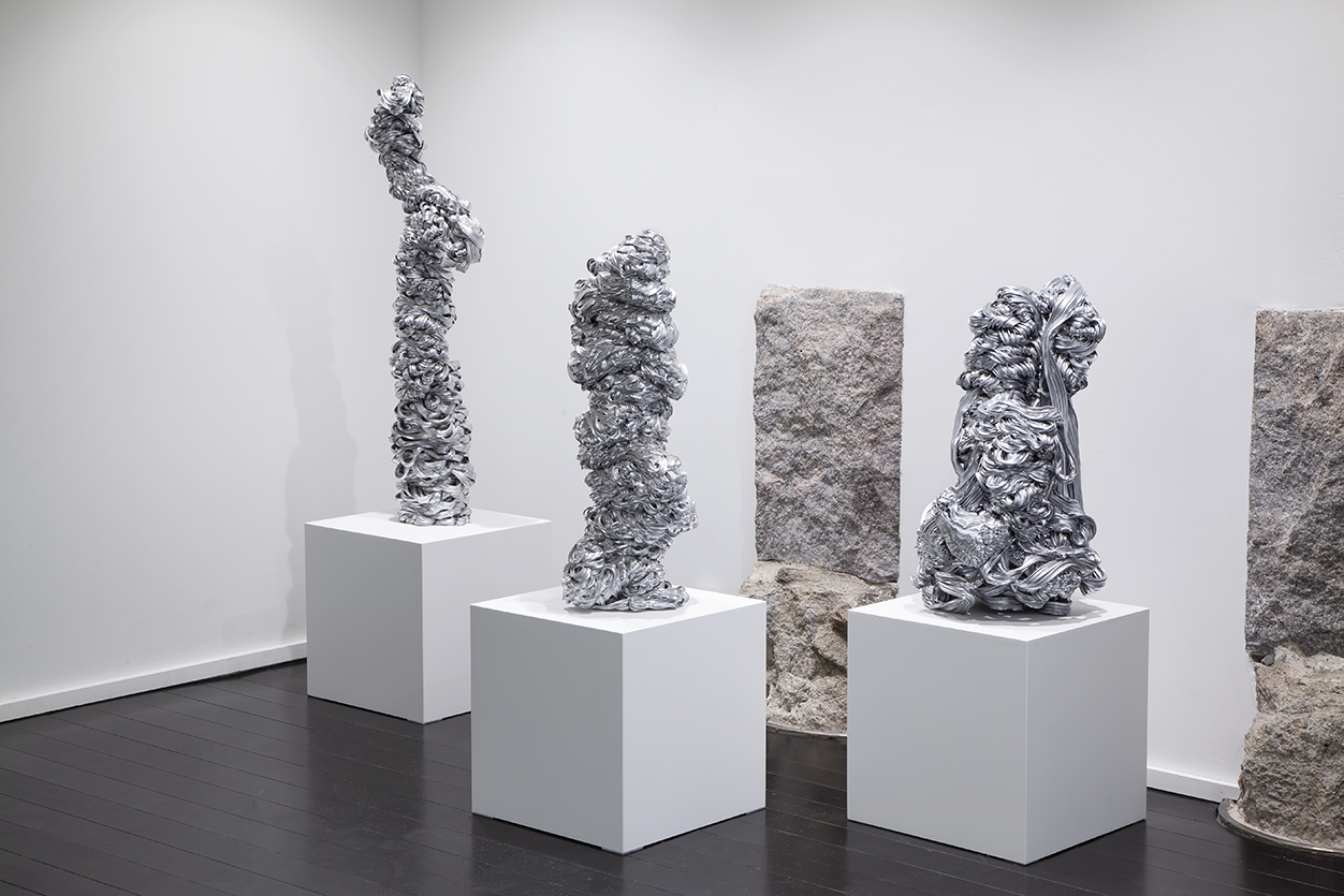 Lana Haga (s.1986) käyttää veistoksissaan teollisuuden ylijäämämateriaaleja, muovia ja tekstiilejä ottaen näin osaltaan kantaa luontoa saastuttavaan ylituotantoon ja ekologisen romahduksen uhkaan.