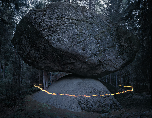 Tulen avulla kuvaan liikettä, ajan kulumista ja ihmisen olemassaoloa ilman näkyvää hahmoa. Esimerkiksi iltahämyiseen kuvaan on jäänyt näkyviin veneessä olleiden tulien jättämät jäljet. Toisinaan tutkin liikettä myös kohteen kannalta. Kamerani voi olla kiinnitetty liikkuvaan veneeseen, jolloin pitkä valotusaika ja liike-epäterävvys abstrahoi kohteen ulkopuolisen maiseman. Saatan synkronoida kameran myös maapallon pyörimiseen, jolloin kuva ilmentää maan liikettä suhteessa tähtiin. Olen huomannut myös asettaneeni itselleni epämuodolliset säännöt ja haasteen: valotus yhdelle isolle laakafilmille, valmis rajaus kuvaustilanteessa eikä kuvan sisällön muuttamista jälkikäteen. Kaikki kuvani ovat siis suoria valokuvia siitä, mitä kameran edessä on tapahtunut. Mitään efektejä ei ole luotu kuvankäsittelyohjelmalla.