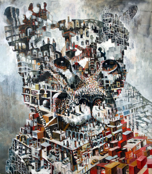 Vuoden nuoreksi taiteilijaksi 2008 valittu kuvataiteilija Samuli Heimonen (s.1975) maalaa pääasiassa suurikokoisia öljyväritöitä, joista hän kertoo: Maalauksissani esiintyy usein jotain ihmistä suurempaa. Useimmissa maalauksissani ihmisten rakennelmat saavat jättiläismäisen eläimen muodon. Ihminen on osa tuota rakennelmaa ja ikään kuin asuu sen sisällä ja pinnoilla. Lähtökohtani on näyttää miten asiat ovat suhteessa ihmiseen ja miten ihmiset ovat yhdessä. Vaikka teokset eivät kerro eläinten maailmasta, olen halunnut käyttää eläimen hahmoa metaforana ihmisen toiveille, tavoitteille ja peloille. Eläin tuntuu minusta kiteyttävän hienosti jotain peri-inhimillistä. Eläin tai luonto on peili, jota vasten on kiinnostavaa tutkia ihmistä.